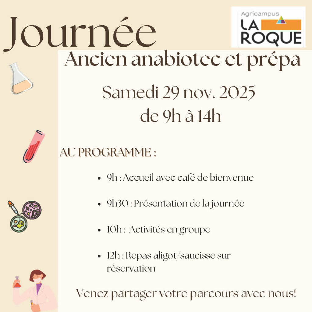 Nous avons le grand plaisir de vous convier à la Journée des Anciens du BTSA ANABIOTEC ainsi que des anciens Prépa vétérinaires et ingénieurs agronomes , qui se déroulera